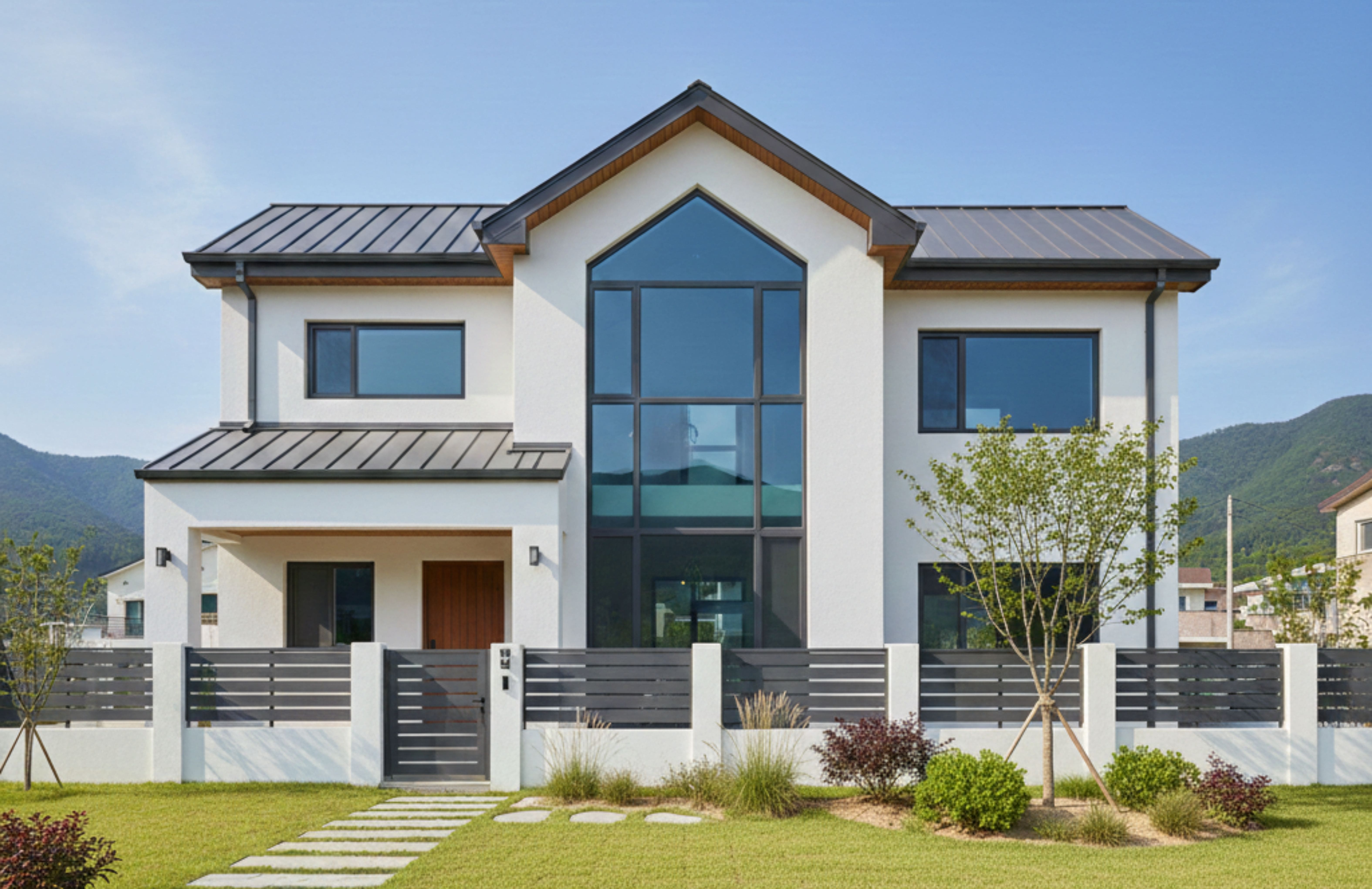 박공지붕을 기본으로 한 2층 단독주택으로, 화이트 외벽과 징크 지붕의 조합이 깔끔한 인상을 줍니다. 중앙부는 복층 높이의 유리창을 적용해 외관의 중심을 형성하고 내부 채광을 강화했습니다. 1층에는 거실과 주방 등 공용 공간을 배치하고, 2층은 침실 중심의 사적 영역으로 구성해 생활 영역을 명확히 구분했습니다. 전체적으로 단순한 매스와 정돈된 창 배치가 특징입니다.